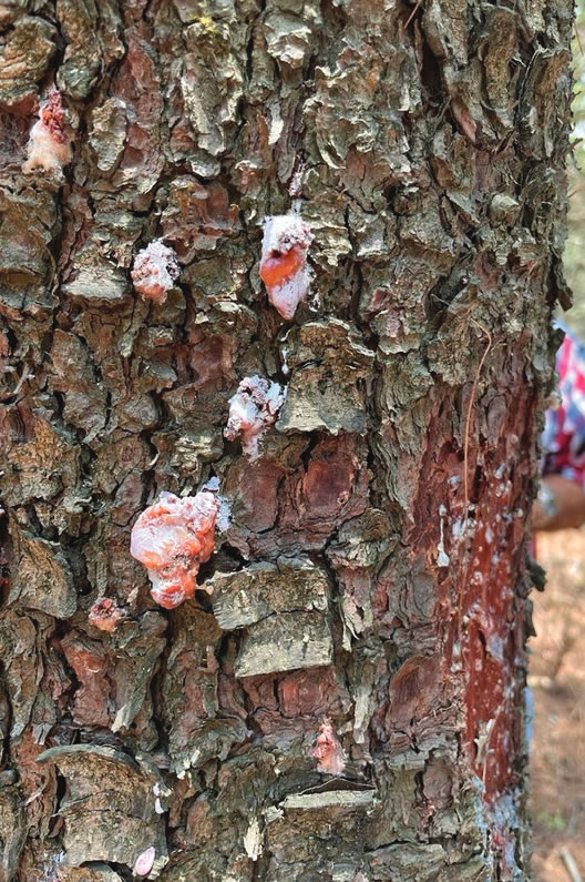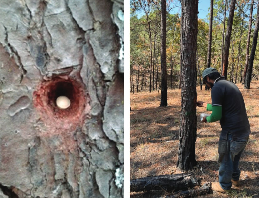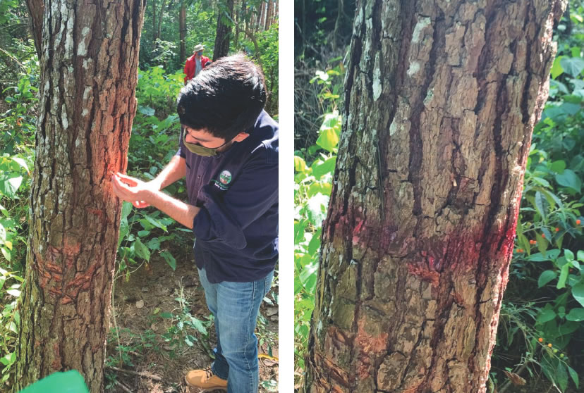 Los troncos infestados tienen muchos pequeños orificios hechos por los escarabajos. Normalmente de estos orificios emana sabia o resina, ya sea color blanco o rojizo.